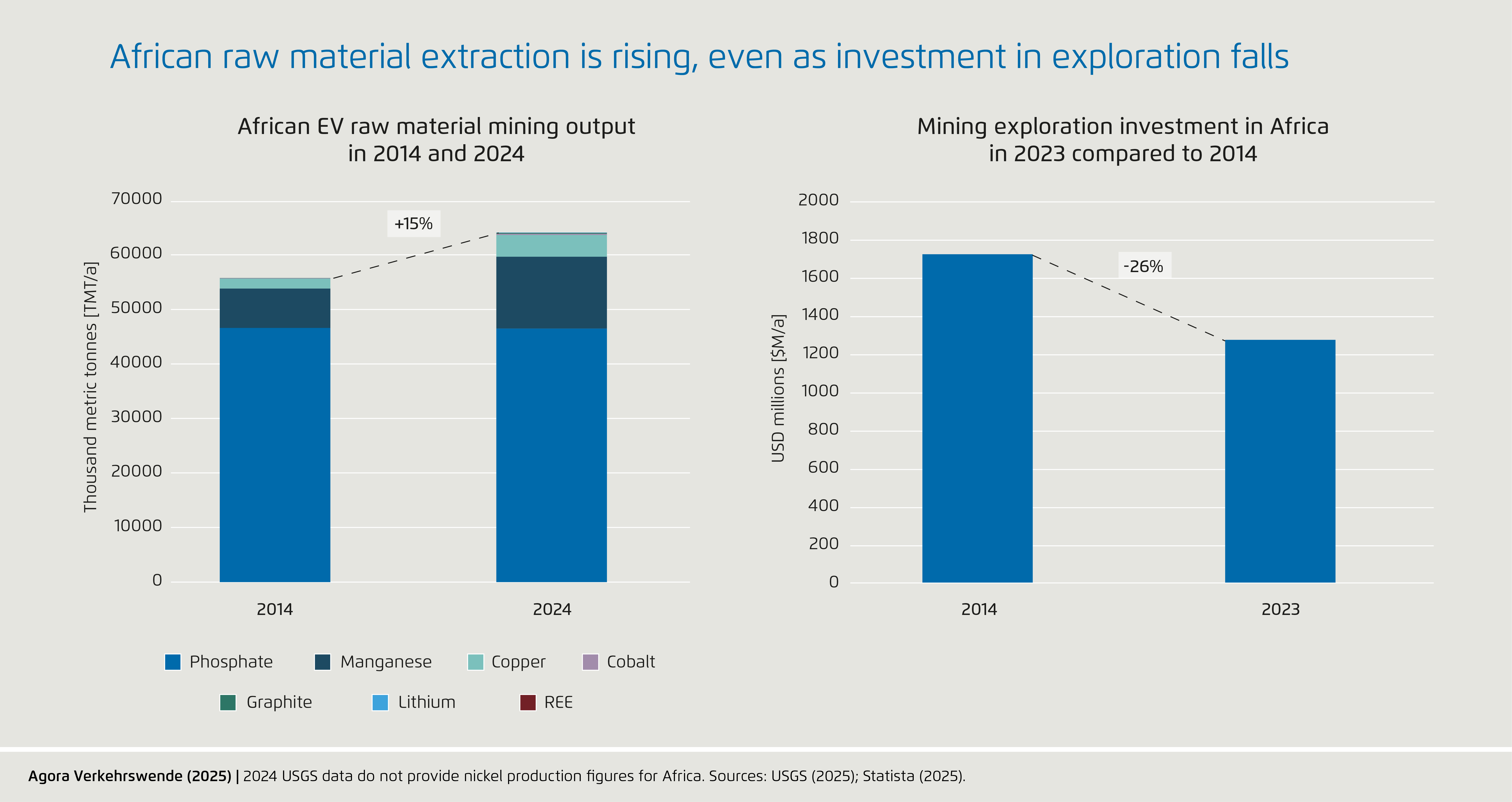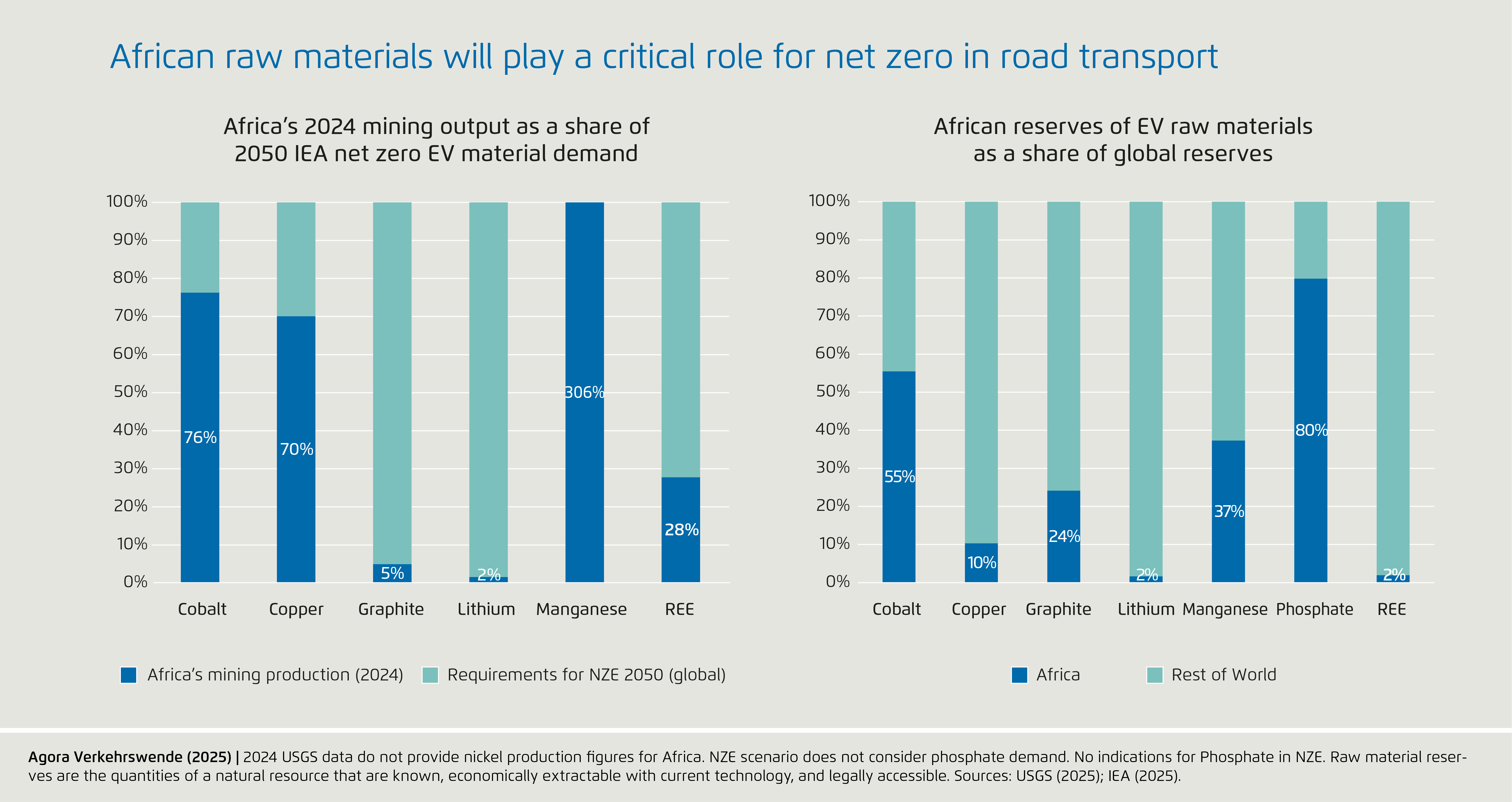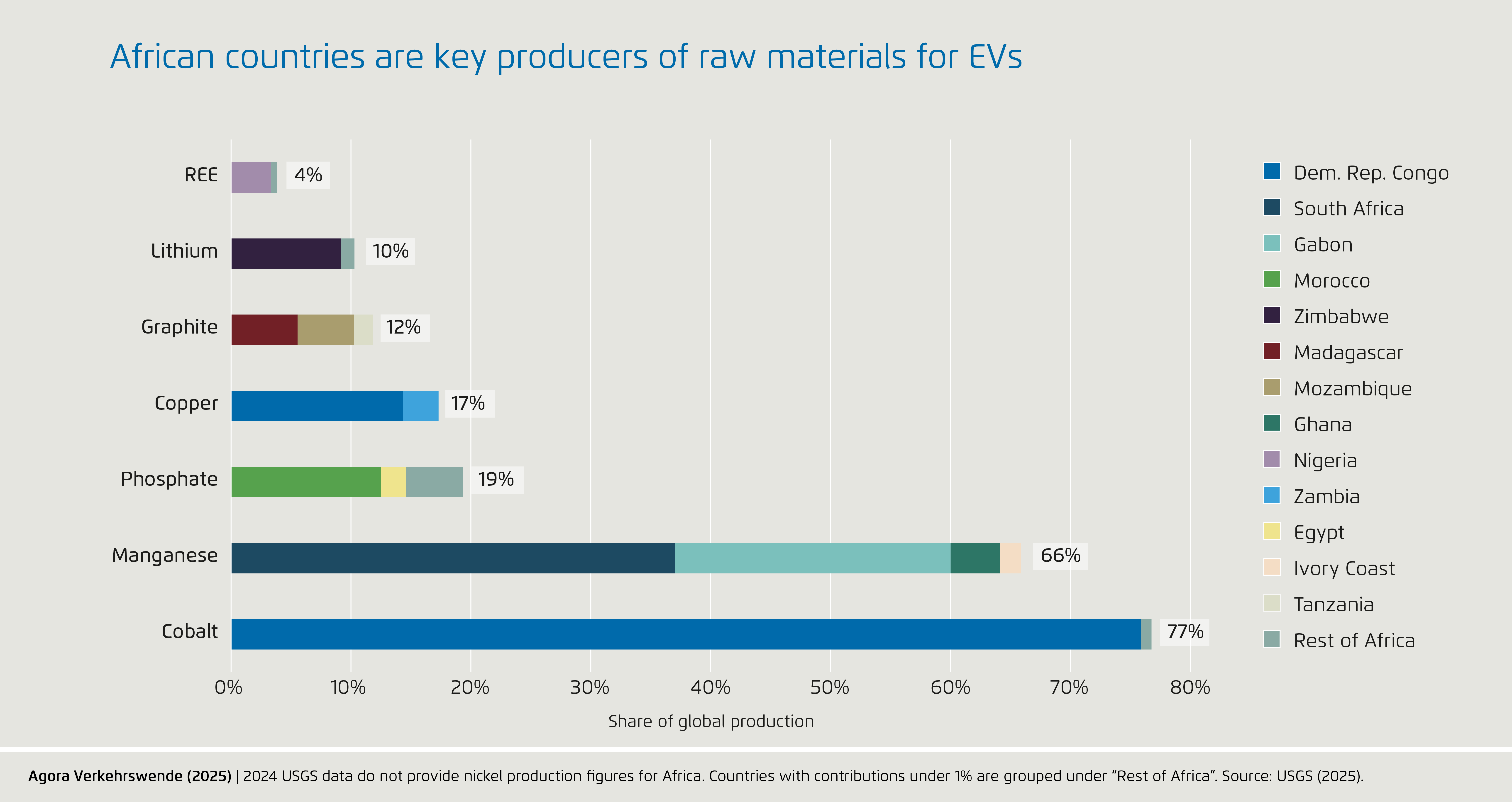 - Agora Verkehrswende (2025): Africa’s Raw Materials for Electric Mobility at a Glance. How abundant raw materials for electric vehicles in Africa create opportunities for domestic development in partnership with Europe.