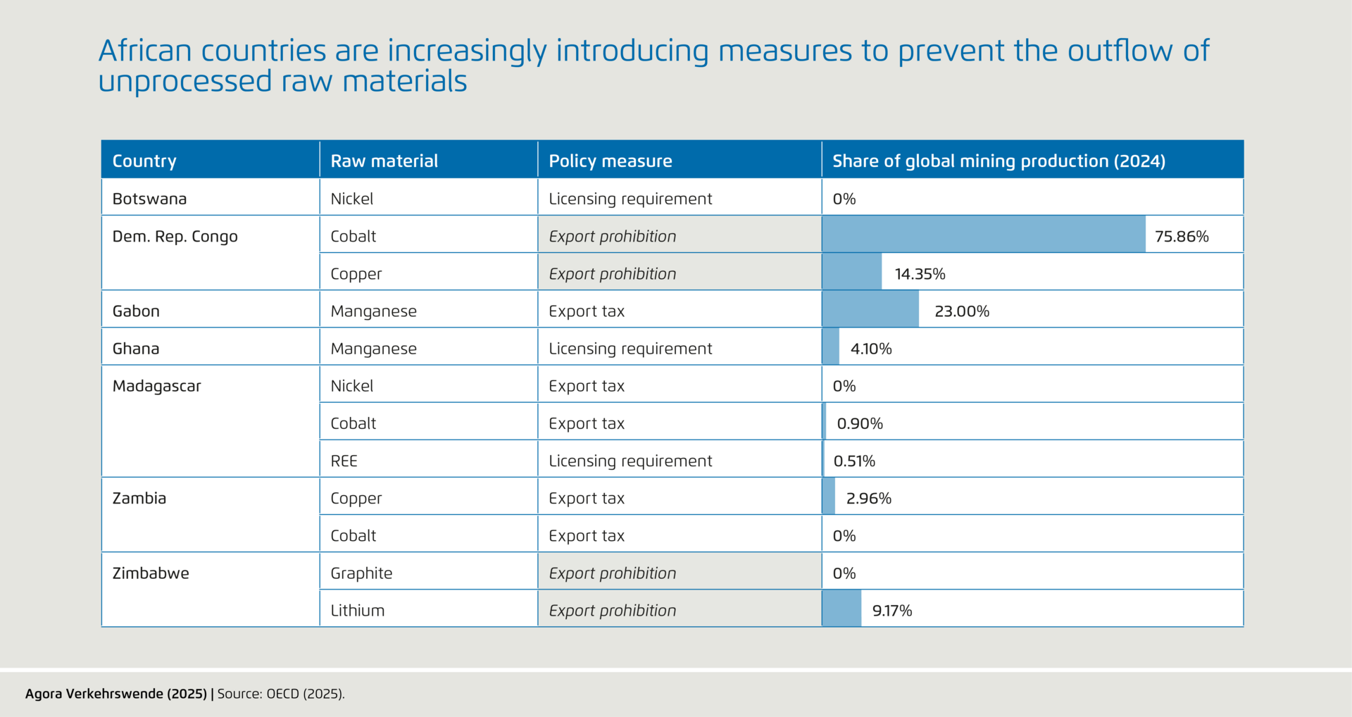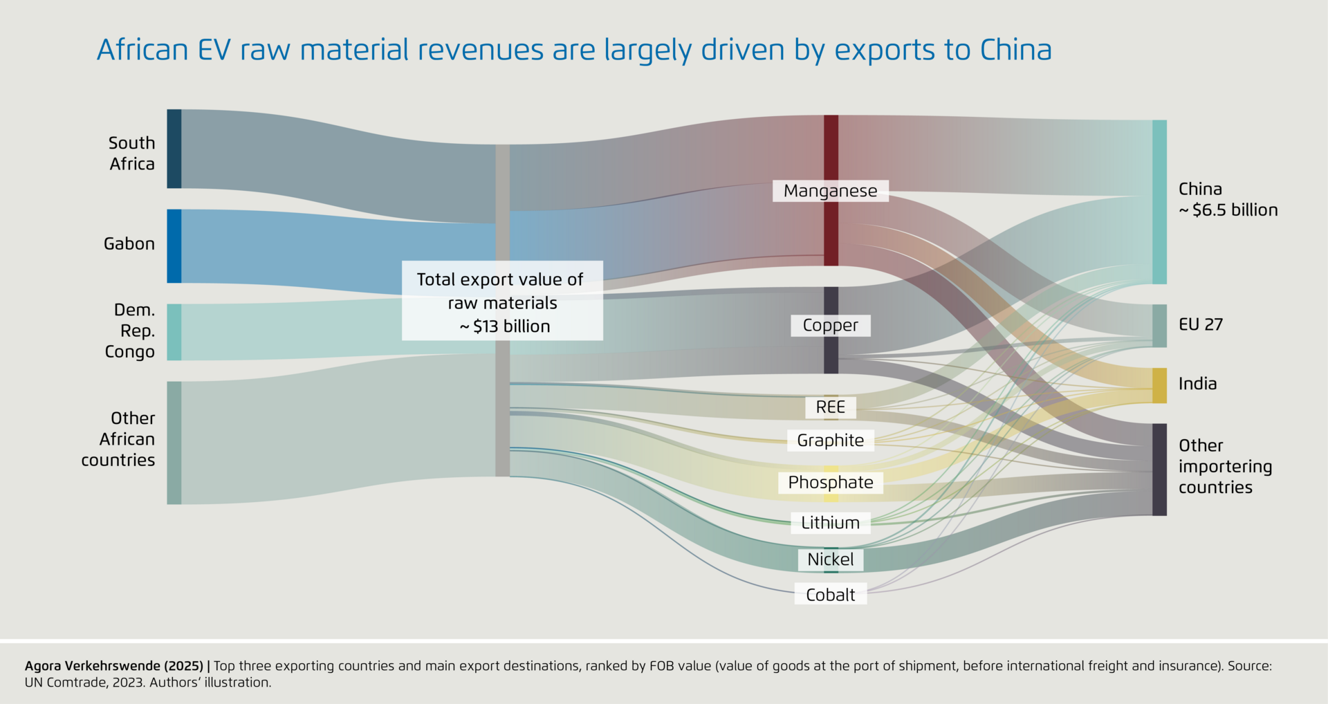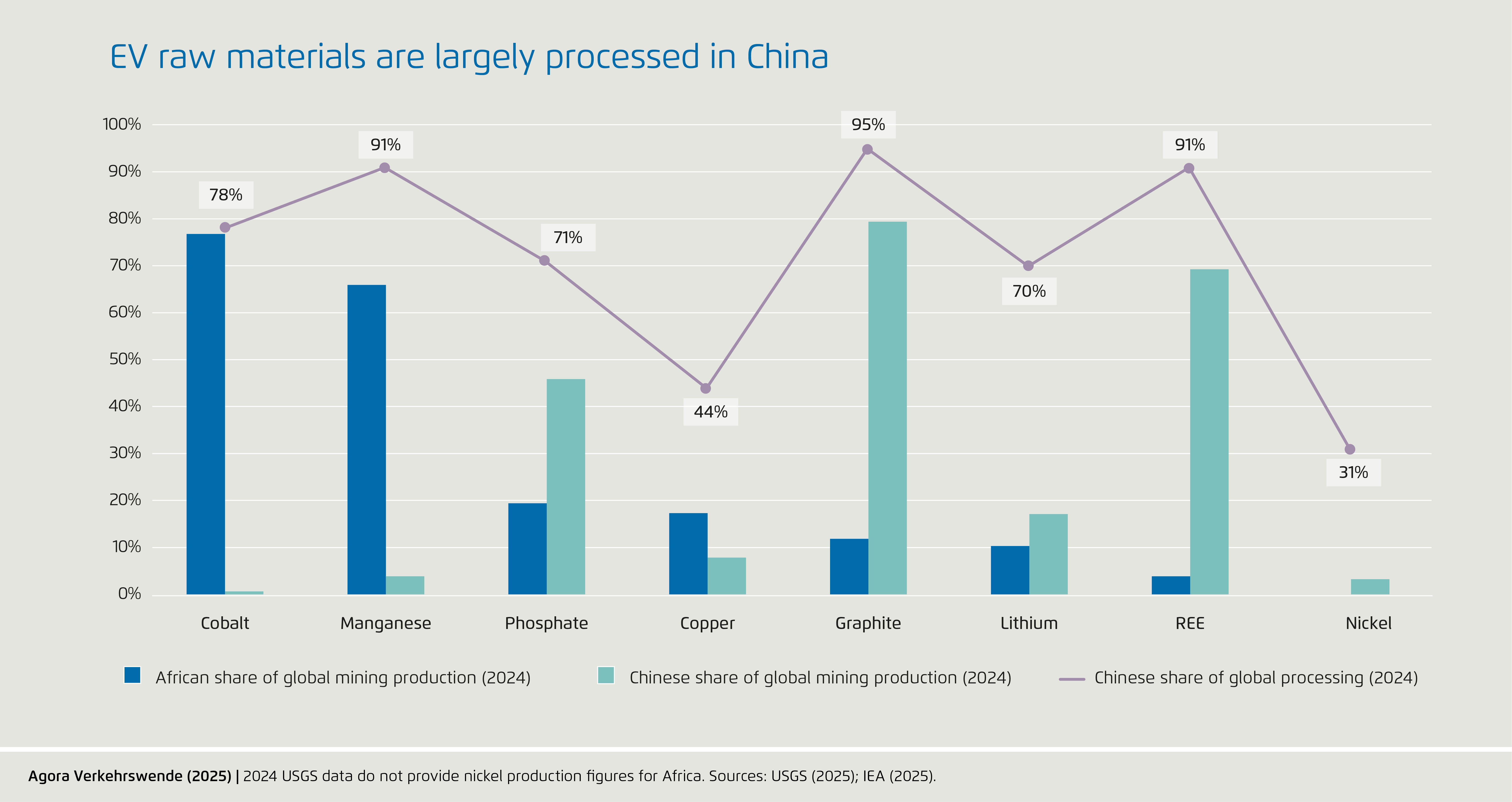 - Agora Verkehrswende (2025): Africa’s Raw Materials for Electric Mobility at a Glance. How abundant raw materials for electric vehicles in Africa create opportunities for domestic development in partnership with Europe.