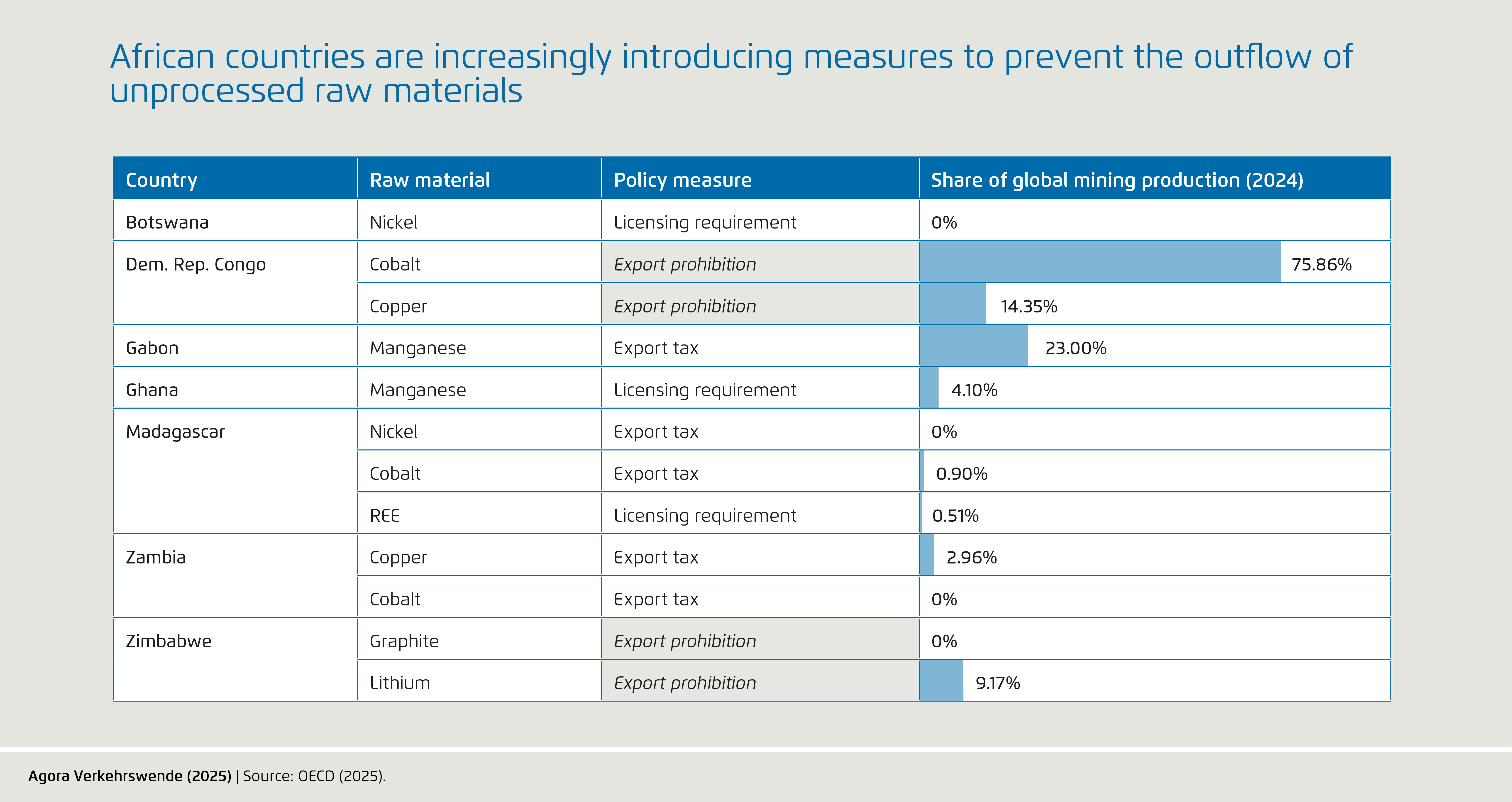 For clusters to emerge, decisive policy action is needed: Establishing linkages across the value chain can be difficult in practice, for this requires coordinated industrial policy action and sustained strategic cooperation over time. A country’s capacity to pursue such a strategy will depend on numerous factors, including existing industrial capacity, access to affordable energy, the existing infrastructure base, human capital availability,[23] and access to affordable finance. Nonetheless, African countries have been increasingly taking action to enhance the value added derived from the minerals industry. Export restrictions on unprocessed raw materials, such as those implemented by the Democratic Republic of Congo (DRC) and Zimbabwe, are one example of policy action in this area (see Figure 6).[24] Other countries have introduced additional measures to penalize the export of unprocessed minerals. While such policies typically aim to support the development of domestic processing capacity, they also signify a trend towards growing market barriers, rather than mutually beneficial regional cooperation. Insofar as such measures undermine regional cooperation, this could mean lost opportunities for the international pooling of expertise and infrastructure, with attendant negative effects for regional industrial capacity and value creation.