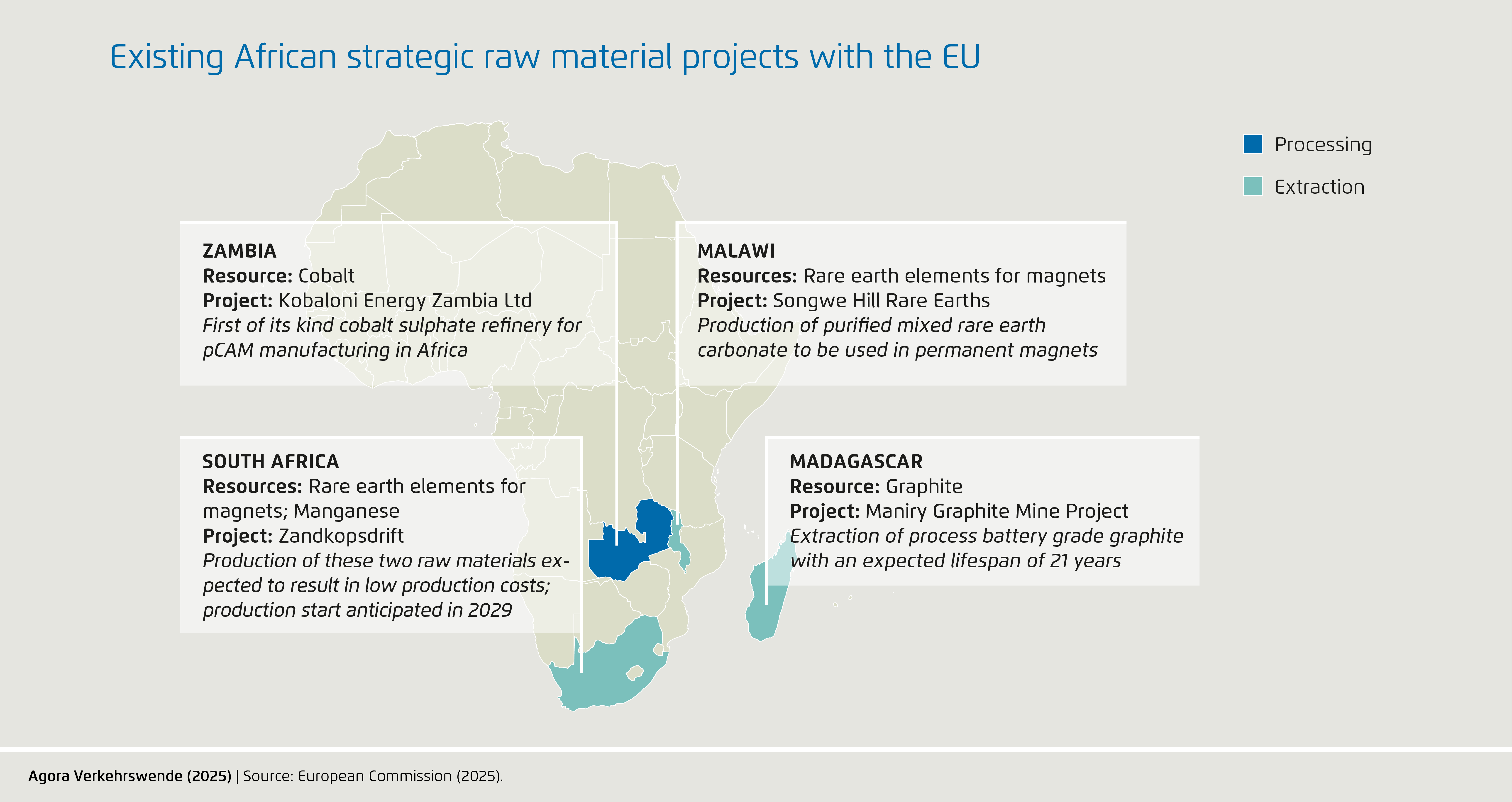 Africa–EU Cooperation promises to yield significant mutual benefits: African countries can enhance and expand industrial capacities by pursuing stronger international cooperation with international partners such as the EU. As part of its Critical Raw Materials Act, the EU has identified 13 strategic projects outside the union, four of which are located on the African continent (see Figure 7). These partnerships aim to bolster EU supply chain resilience while also supporting domestic value creation in partnering countries. However, implementation faces challenges, including institutional fragmentation within the EU; industrial policy tensions that (at the moment) prioritize capacity building within the EU; and, perhaps most critically, financing constraints that can hinder long-term project commitments. Projects connected to the mining value chain are highly capital intensive, and are subject to various risks, including uncertain offtake.[27] Sustained EU support, particularly in facilitating offtake agreements with European companies, could provide African producers with stable revenue streams while ensuring secure access for European industries. However, despite engagement from the European Investment Bank and European Bank for Reconstruction and Development or the Global Gateway Initiative, no dedicated EU funding mechanism currently exists for raw materials cooperation. However, the announced EU Energy and Raw Materials Platform could be a promising springboard for bringing together actors on both the supply and demand sides.[28] Ultimately, EU support for projects across the entire value chain – from mining to processing and beyond – could be important for strategic partnerships to be successful and reap mutual benefits.
