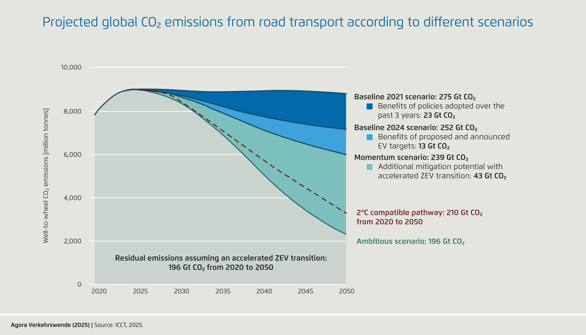 Recent analysis from the International Council on Clean Transportation (ICCT) confirms that the transition to e-mobility is not just a theoretical potential, but is already underway, driven by concrete policy action. The ICCT’s Vision 2050 report shows that policies adopted in major economies over the past few years have significantly improved the emissions outlook, putting global road transport CO₂ emissions on track to peak as early as 2025.