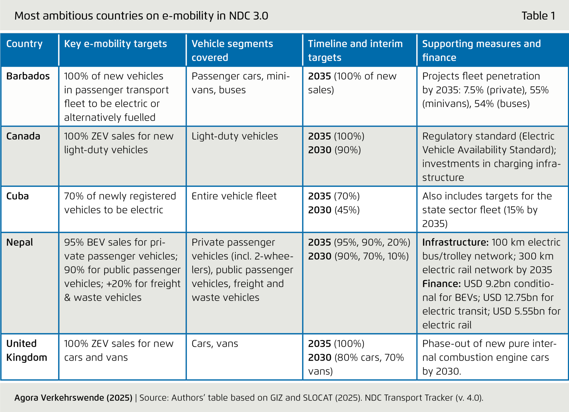Among the 28 countries with specific EV targets, some nations stand out by presenting not just percentage targets for EV sales, but also broad vehicle-segment coverage. In addition, they show a commitment to complementary infrastructure and industrial policies, and have undertaken detailed financial planning. The next table shows five of the most ambitious nations in e-mobility among early NDC 3.0 submissions.