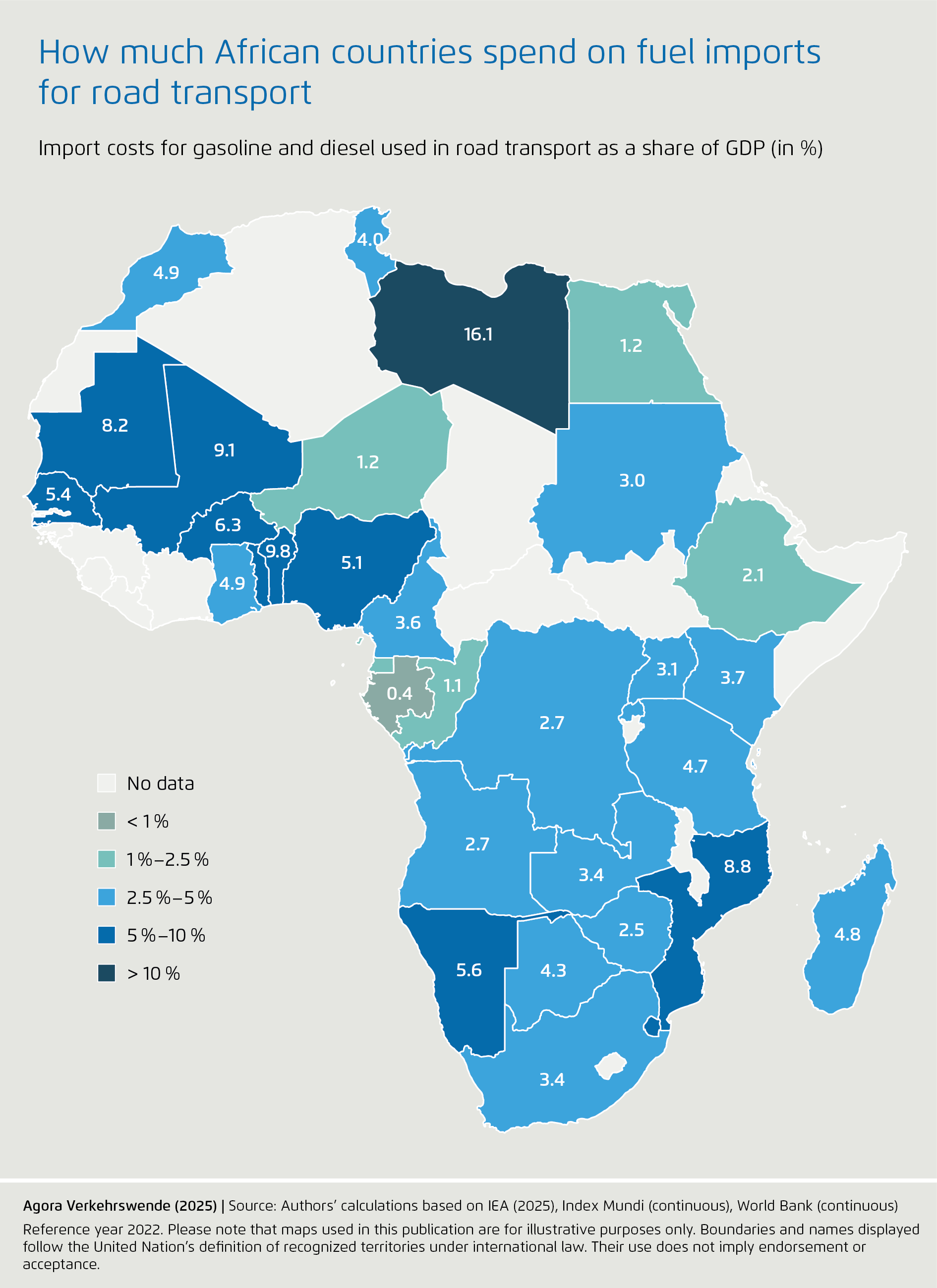 African countries have enormous potential to reduce dependence on fuel imports by taking advantage of their domestic renewable energy sources. Fully tapping this potential requires a transformation to cleaner transport based on electric vehicles as well as shared and active mobility. The following infographics of Agora Verkehrswende illustrate country-specific expenditures on fuel imports for road transport and compare the energy cost differences for vehicle users between using combustion and electric cars. Our methodology is explained at the end of this webpage.