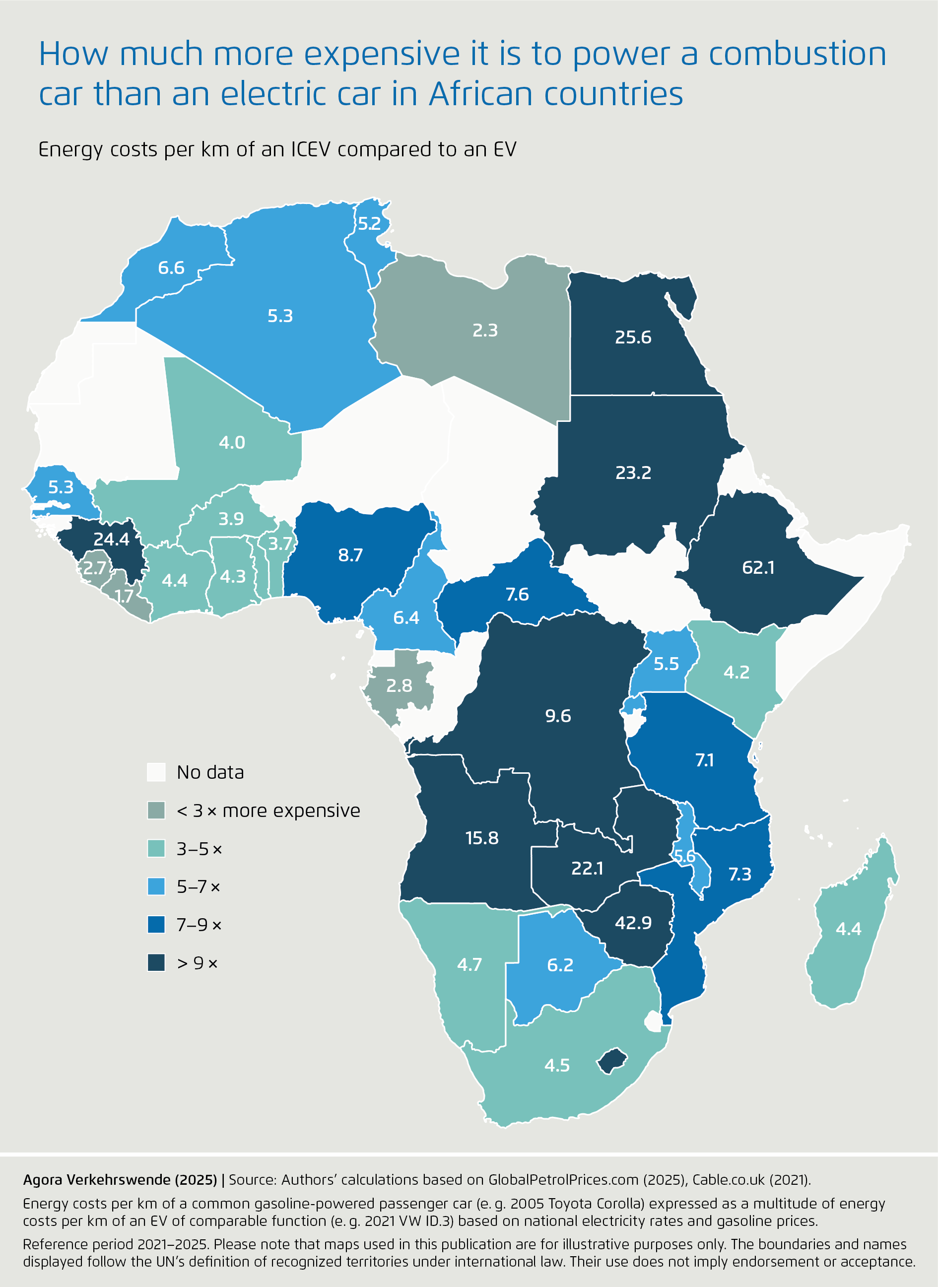 To compare the energy costs of ICEVs relative to EVs, we used national electricity rate and gasoline price data, which we multiplied by the consumption required to drive one-hundred kilometres. Electricity rate data for 32 countries were obtained from GlobalPetrolPrices.com, which provides a two-year national average (2023–2025), broken down by business and residential rates. As regulations differ for EV charging– with some countries showing higher rates for businesses than for household consumers – and in the absence of comprehensive data on charging tariffs, we used the average for each country between the respective business and residential rates. We drew on 2021 data from a British price comparison portal (Cable.co.uk) estimate missing figures for 19 countries without entries in this dataset, after cross-checking entries for coherence. No data were available for countries including Eritrea, Somalia, and South Sudan. All prices are given in nominal US dollars.