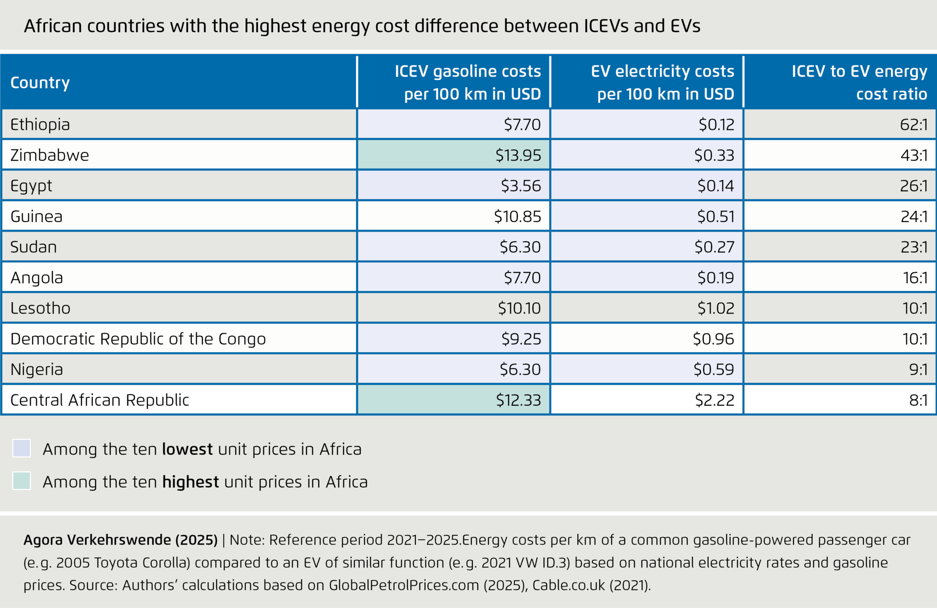 ICEVs energy costs are much higher than those of EVs in most African countries. Our calculations show that across Africa, the median energy cost difference between a gasoline-powered passenger car (internal combustion engine vehicle, ICEV) and an electric car (EV) stands at 5.5 to 1. This means that, at the median, ICEVs energy costs are more than five times that of EVs over a given distance (see at the end of this webpage an explanation of the methodology). One main reason for the competitive edge enjoyed by EVs is their energy efficiency: The direct use of electricity in battery electric vehicles is the most efficient energy option, as it largely outperforms energy conversion in internal combustion engines; EV efficiency is further bolstered by features such as regenerative braking.[6] The other main reason is the different price levels between gasoline and electricity in most parts of Africa.