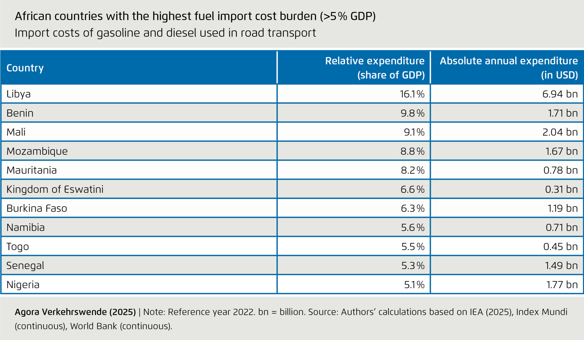 Eleven African countries spend more than five percent of GDP on gasoline and diesel imports (see table below). This is a level similar to median African government spending on health (5.1% in sub-Saharan Africa)[3] or education (4.0%).[4] While gasoline import exposure is significant in some countries – including in Libya (12.1% of GDP) and Benin (6.9% of GDP) – diesel imports impose a greater financial burden. Median African spending on gasoline imports as a share of GDP is 1.3%, compared to 2.1% for diesel. In Mauritania, Mozambique, and Mali, diesel imports alone account for more than 5% of GDP. Libya is an outlier, with an exceptionally high combined gasoline and diesel import bill equal to 16.1% of GDP, making it not only the country with the highest share in Africa but also the second highest globally (following the small island developing state of Curaçao). This high share can be explained by domestic policy choices, including the promotion of widespread private vehicle ownership (480 vehicles per 1 000 inhabitants, the highest in Africa)[5] in combination with high fuel subsidies. The combined value of gasoline and diesel imports as a percentage of GDP is lowest in Gabon (0.4%), followed by the Republic of the Congo (1.1%).